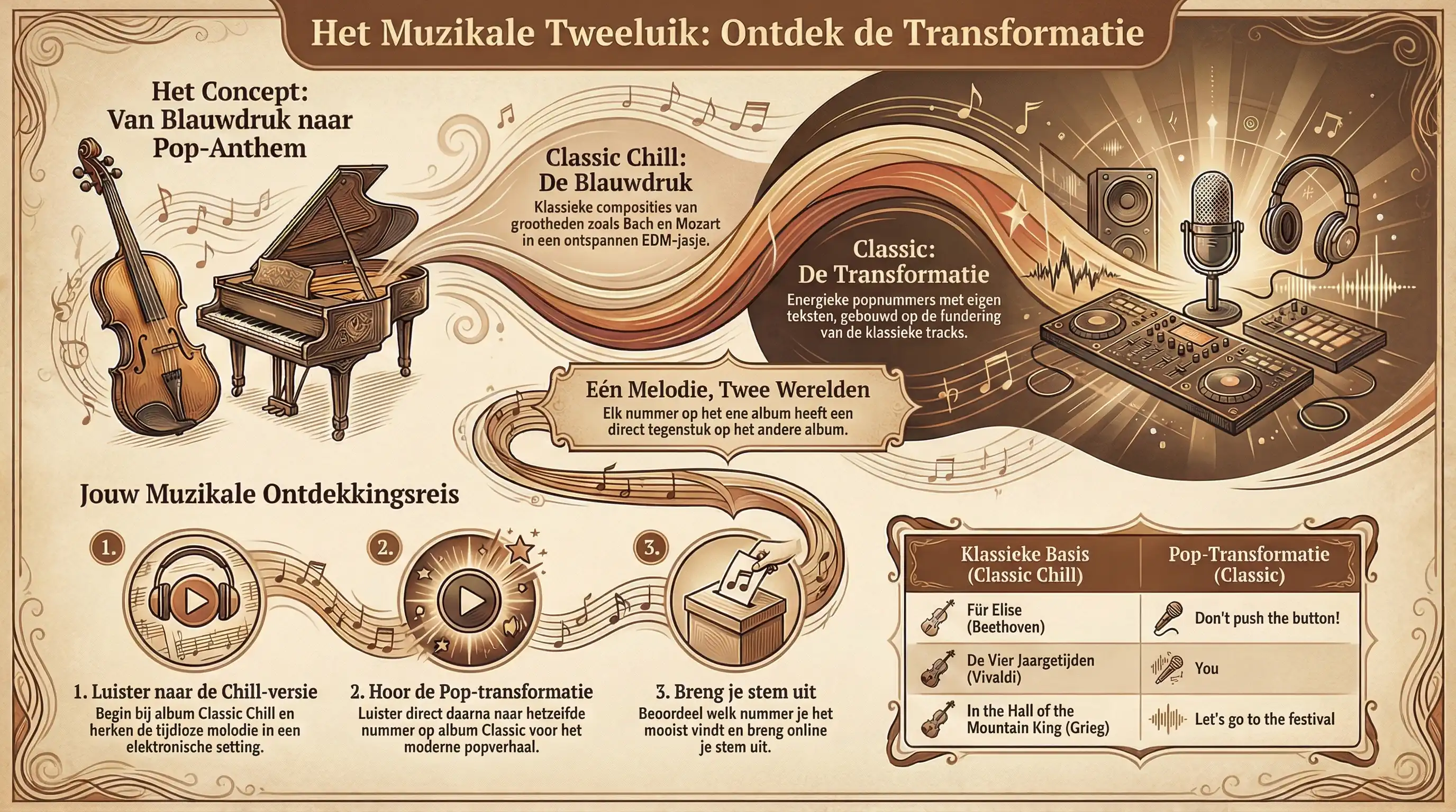 Op Classic hoor je de volledige transformatie. In exact dezelfde volgorde als het zusteralbum vind je hier energieke EDM-popnummers, stuk voor stuk geïnspireerd op de tracks van Classic Chill. Voor deze versies heb ik eigen teksten geschreven, waardoor de klassieke thema's een eigentijds verhaal en een menselijke stem krijgen. Laat je verrassen door hoe de composities van de grote meesters de basis vormen voor moderne songs met een geheel eigen boodschap.